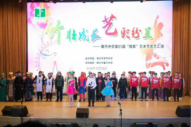 满载成功和收获,怀揣理想与希望,翠竹中学于12月28日——2018年的最后一个周五,迎来了第二十一届“雅翠”艺术节文艺汇演。七、八年级全体师生、各班家长代表汇聚一堂,共享这场艺术的视听盛宴。 各班精心组织,反复排练,为艺术节汇演做好了充足准备,内容涵盖诗朗诵、歌唱、舞蹈、小品、服装秀和运动秀等,可谓是花样百出、精彩纷呈。 一开场,配乐诗朗诵《少年中国说》一展少年的激情与斗志,奏响时代的铿锵序曲。器乐合奏《沧海竹语》汇集七种乐器,各具特色的同时和谐相融,尽显丝竹新韵的雅尚,交汇出传统与现代的动人乐章。歌舞表演是重头戏,师生合作的小合唱、活力四射的舞蹈串烧、动感酷炫的电光舞,赢得了场下观众的连连赞叹与阵阵掌声。要说最赚笑声的,当属小品节目。《三顾茅庐》将耳熟能详的典故进行新编,以轻松幽默的方式重话历史,表演同学恰到好处的演技赢得大家一致好评。除此之外,将俏皮可爱的舞步与蓬勃向上的体操巧妙结合的男子团体操、展男儿运动风采的篮球表演、创想奇出的服装秀等也同样给大家留下了深刻印象。 所有节目汇演完毕后,王爱晖副主任宣布了“最佳风采奖”等奖项名单,获奖班级代表从学校领导手中接过获奖证书,会场内掌声一片。 时间流逝,文艺汇演圆满落下帷幕,但舞台上的风采却将一直延续,蔓延到快乐的校园生活中去。相信翠中学子能在新的一年中勇攀高峰,向着青春更美好的样子继续奋进,共同拥抱2019年崭新的开始! (撰稿:孙娟)