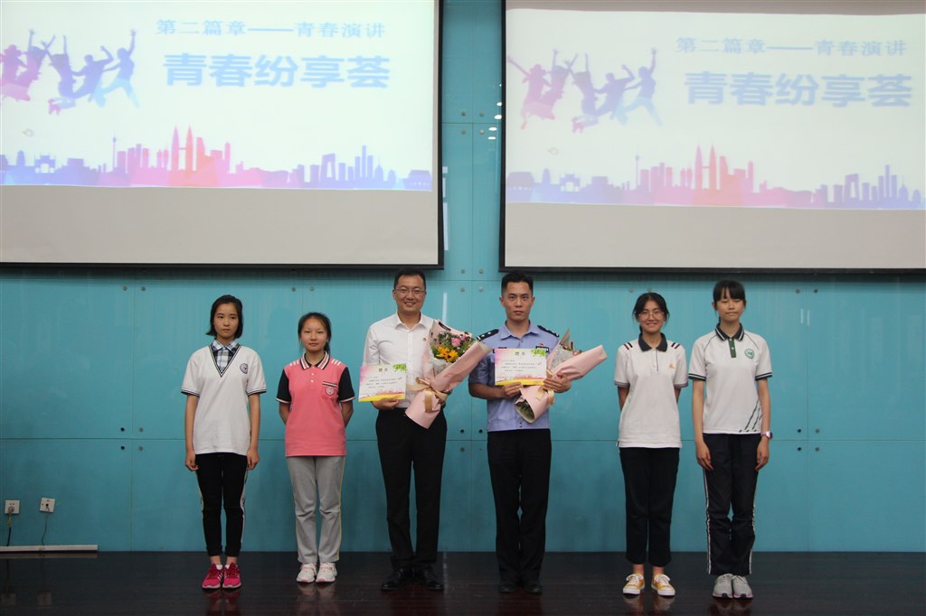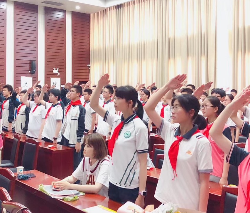 回想4月,我们相聚翠中,在隆重的启动仪式中开启了团队学习的全新征程,5月我们携手丽华,在张太雷纪念馆中缅怀先烈,对话五四,传承红色精神;上周我们前往朝阳,在精彩的微团课观摩中,领略时代进步感受国之伟大! 带着一份期待,“青春·致敬”六校团队联盟又开启了一场青春的盛会!6月3日下午,翠竹中学、朝阳中学、实验中学、丽华中学百名师生代表来到省中,在这个人杰地灵的著名府学中,共同迎来一个特殊的节日——14岁青春成长仪式! 第一篇章:青春恰自来 一段温馨的视频,展示了四校青年成长的金色记忆:缤纷的中队课,可爱的辅导员,丰富的中队活动……红领巾,少先队,伴随着我们点滴成长。悠扬的旋律中,全体队员向星星火炬队旗敬上最后一个队礼,郑重地解下胸前飘扬的红领巾,将它轻轻抚平折好,并放进本次活动特制的红领巾珍藏盒中。而解下红领巾的一瞬间,意味着我们已经告别了少先队,正式迈入了青春之门。 第二篇章:青春纷享荟 在迈入青春大门的这一刻,什么是青春应有的状态?什么是青年该有的模样?……带着孩子们对青春的困惑,四校联合邀请到了三位优秀的青年嘉宾,一起聆听他们对青春的答卷。 来自省中高一的冼奕辰是优秀学生的代表,他用激情自信的演讲,讲述他与省中的故事,缤纷的校园生活,精彩的社团活动,始终不忘的是一份对理想的执着追求与期待;来自中车戚墅堰研究所的王楠书记是青年工匠的楷模,他用科学专业的讲解,结合中国高铁的发展,带孩子们领略中国速度,感受锐意进取、钻研创造的青年工匠精神;来自常州警方新媒工作室的阿汤哥是一位网红警察,他用铿锵有力的话语,介绍了他从初中到工作岗位上的一段段成长经历,从籍籍无名的小警察到红遍网络的正义使者,绝不放弃、坚持到底,是他成长的关键词;不畏困难、创新突破,是他工作的座右铭。并现场展示防诈骗技巧,风趣幽默,受到同学们的欢迎。在同学们的强烈呼声下,六校联盟邀请他们成为青年的成长导师暨校外辅导员,并现场颁发聘书。 第三篇章:青春进行曲 青春远行的下一站是什么呢?共青团,便是青少年进一步前进的方向。一个学期以来,通过不懈的努力,有一批优秀的同学用实际行动积极向共青团组织靠拢,经过团组织的考验,终于光荣地加入了中国共产主义青年团这个优秀的组织。 常州市教育局统群处刘旭娇副处长现场宣读新团员名单后,各校团委书记为新团员代表颁发、佩戴团徽。新团员们面对神圣的团旗,庄严宣誓! 在嘹亮的青春之歌《光荣啊!中国共青团》中,14岁青春成长仪式圆满落幕! 青春,人生之春,人生之初,人生之华。青年,家庭之希望,时代之精神,国家之栋梁。 愿每一位新青年不忘约定和理想,努力奋发、快乐奔跑!青春万岁,强国有我!