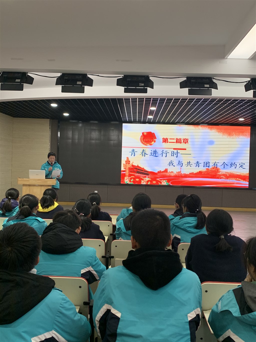 第二篇章“青春进行时—我与共青团有个约定”中,校团委谢笑书记为大家解读入团的意义,温情的话语中饱含对青年们的期望:希望青年们能够响应党的召唤,结合历史的需要,不忘初心,方得始终,拥有伟大的志向,坚持最初的梦想;珍惜时光,勤奋学习,把团员标准落实在平时的一言一行之中去,努力提高自身综合素质;榜样示范,辐射更远,释放正能量,释放团员的魅力,去增添团组织的影响力,去带领身边的同学一起进步,让更多的青年加入到共青团这个先进的群众组织。