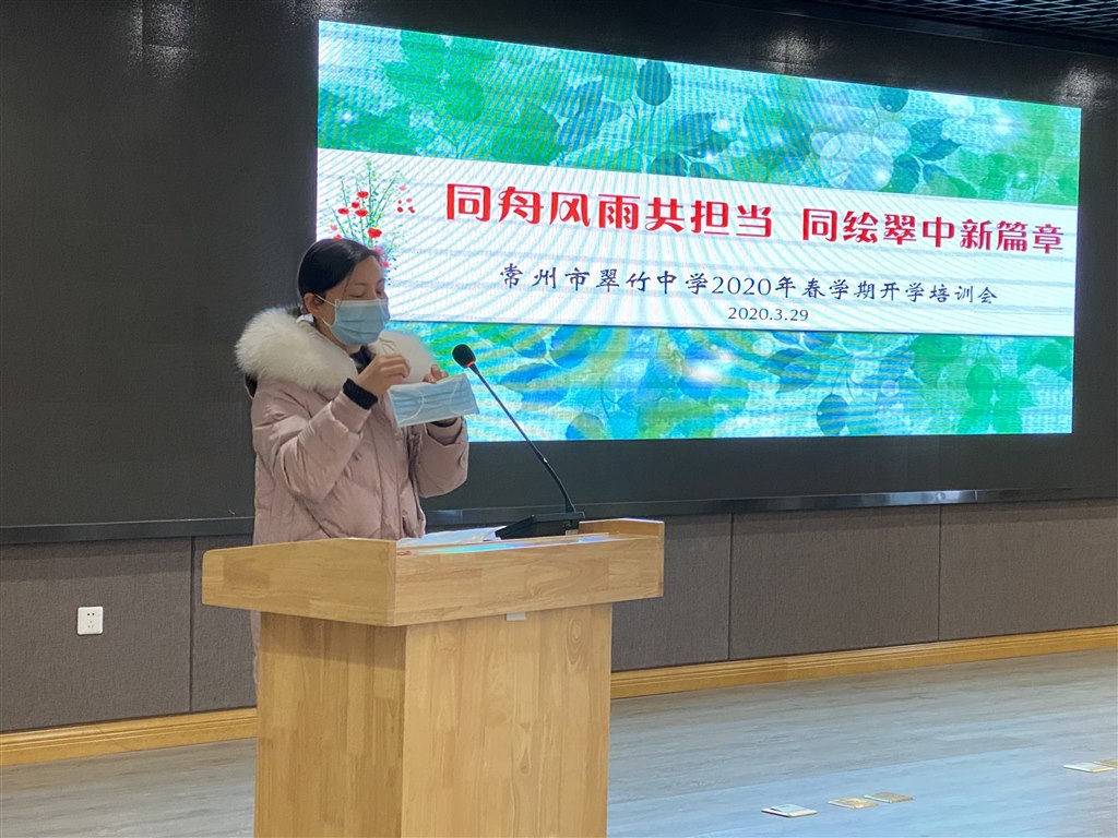 张和英校医首先从专业的角度向教工介绍了开学后疫情防控的注意事项,并就如何通风消毒、如何做好个人防护、如何关注学生健康等方面进行了专业培训。随后办公室宋华燕主任就疫情防控阶段教师的一日常规,工作要求做了明确。屠国斌副校长就开学后如何一手抓疫情防控,一手抓教育教学对教工提出了建议和要求。陈校长最后表示,全面复学之际,学校要确保两条生命线:一是师生健康的生命线,二是教育质量的生命线,希望教职员工提高思想认识,做自尊的翠中好教师;严格执行规定,做自律的翠中好教师;认真开展教学,做自觉的翠中好教师;发扬翠中精神,做自信的翠中好教师,全体翠中人共同守好防疫期间每一道关口,确保师生生命安全。