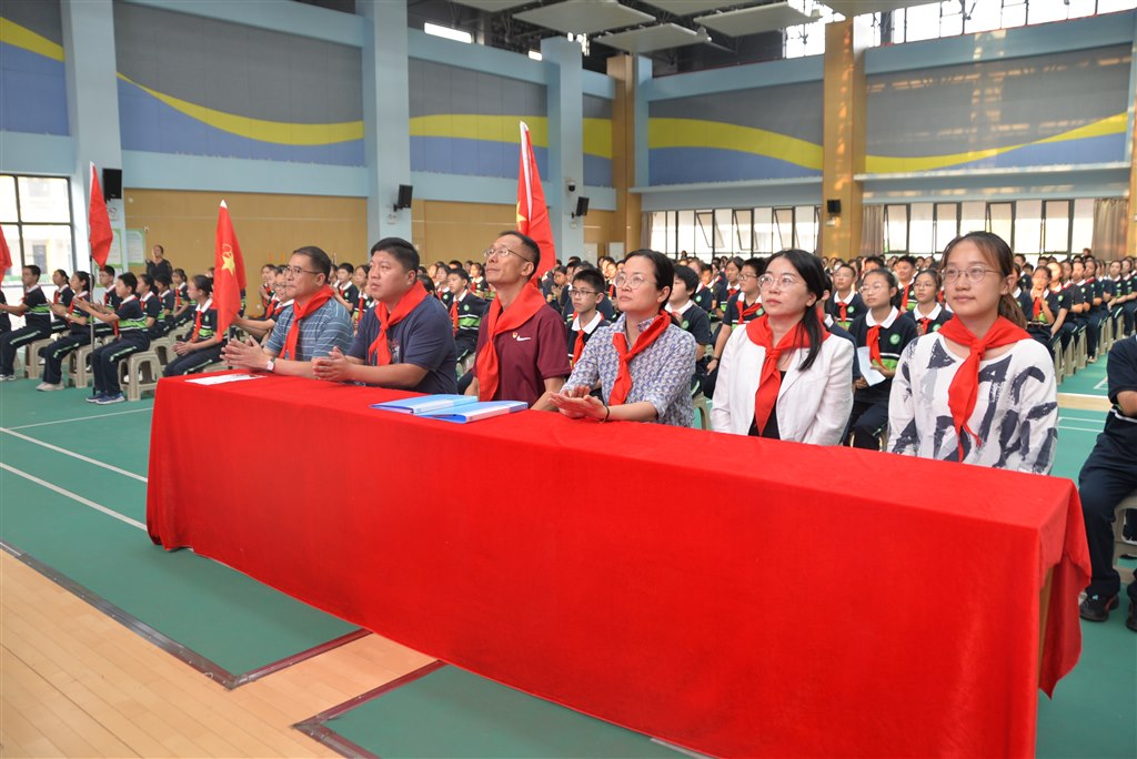 在充满希望的今天,有一群少年,他们怀揣梦想,勇往直前。他们就是翠竹中学七年级的少先队员们1019日下午,翠竹中学七年级在羽毛球馆举行了一场精彩的建队换巾仪式暨辅导员受聘仪式,少先队员们在庄严的仪式中,感悟责任,明确目标,为未来的学习和生活注入了强大的动力。与少先队员们共同见证这重要一刻的还有翠竹中学校党委丁书记、课程处卫主任、师发处陈主任、关工委刘老师、团委恽老师少先队大队辅导员卞老师、年级组长万老师以及8位班主任们。