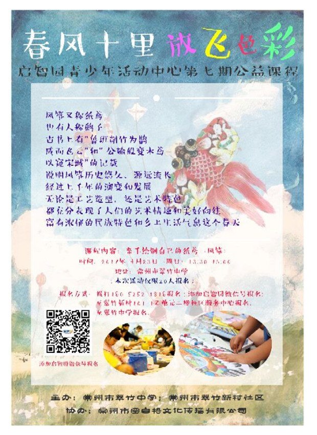 4月23日,春光明媚的日子,常州市翠竹中学启智园青少年活动中心第七期公益课程“春风十里放飞色彩”如期而至。 本期课程的主要内容为:亲手绘制自己风筝并放飞。 风筝,在我国拥有悠久的历史,相传,战国时墨翟以木头制成木鸟,研制三年而成,是人类最早的风筝起源。后来鲁班用竹子,改进墨翟的风筝材质。直至东汉期间,蔡伦改进造纸术后,坊间才开始以纸做风筝,称为"纸鸢"。至此之后,放风筝成为人们喜爱的户外活动。这在古代诗文绘画中均有体现。著名的《清明上河图》中就有老百姓放飞筝的生动景象。 如今在老师的带领下,小朋友们亲手绘制个性化的风筝,并亲手放飞,显得格外有意义。经过一番努力,一个个色彩斑斓的风筝顺利升空。展翅高飞的风筝,长长的五彩的尾巴,操场上奔跑的一个个小小的身影,阳光下一张张灿烂的笑脸,构成了春光下最美的风景。 自启智园青少年活动中心成立以来,常州市翠竹中学始终坚持面向社区孩子提供免费的课程,让社区孩子在家门口体验、了解相关的科技文化知识,经过不断的探索、改进,翠中启智园已渐渐成为社区孩子拓展视野、放飞梦想的基地,成为每位孩子心中的一片乐土。(毛乐乐)