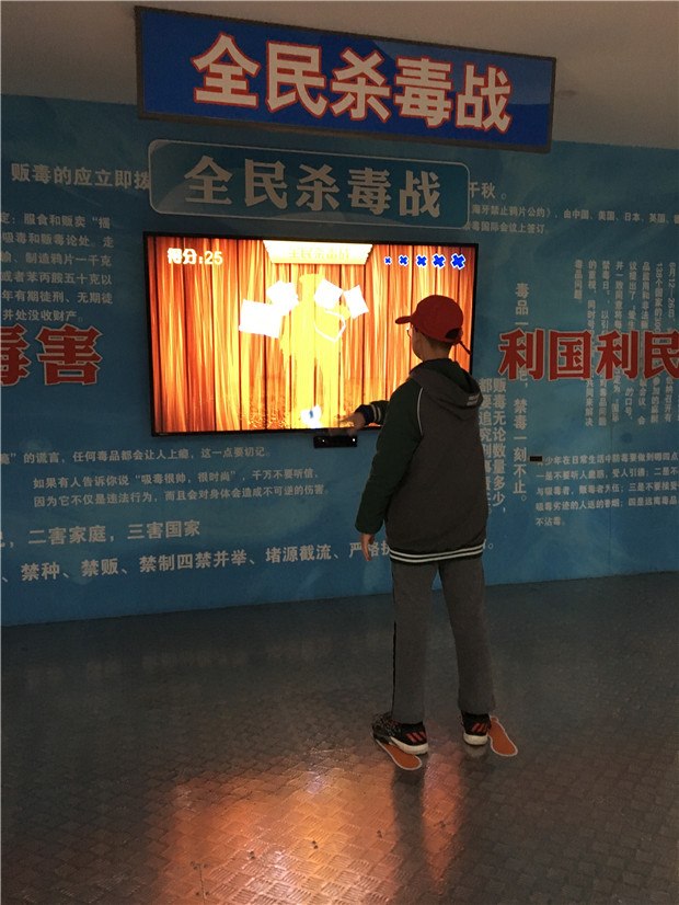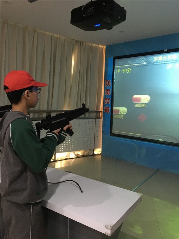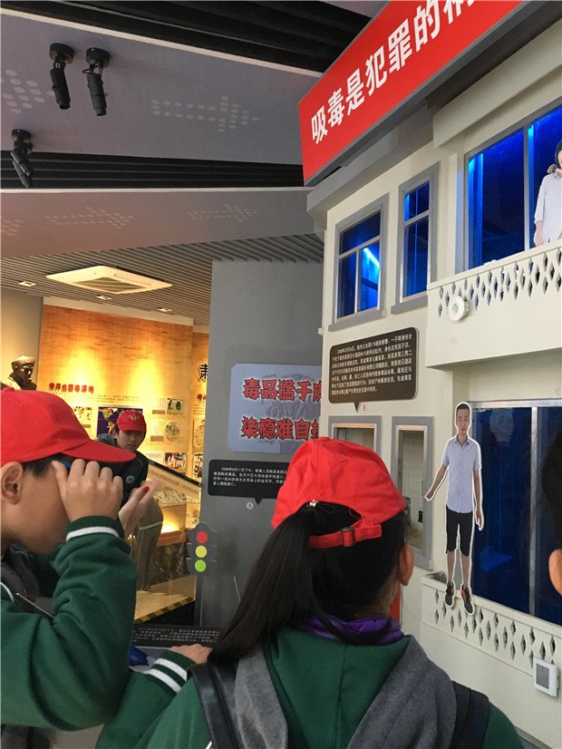 带着一份陌生的憧憬,带着一份强烈的好奇,来自翠竹中学的40名小记者来到常州第四制药厂禁毒教育基地,进行了为期半天的游览参观。展馆以其独具匠心的环境设计、夺人眼球的互动游戏、震撼人心的情景再现、诙谐幽默的禁毒演讲,让禁毒教育生动鲜活起来。 难忘1:吸睛的展馆布置    位于顶层的禁毒展厅,一幅幅图片讲述了毒品的发展演变,美丽的外表下暗藏着危险的信号,透明的玻璃展柜中的毒品模型让人对毒品有了更深层以及更直观的认识。 难忘2:巧妙的互动游戏    毒品知识知多少?在楼下的互动游戏厅,开启了毒品知识闯关模式。“全民杀毒战”,利用高科技热感应技术在电视机上模拟切水果游戏,将不同的毒品一一切碎;“灭毒大作战”,模拟射击游戏,将常见药品与毒品、缉毒警察与毒贩等区分,力求消灭毒品毒贩;“禁毒知识作答”,选择题的形式迅速反映禁毒相关知识,在玩中学,在学中记,枯燥难懂的禁毒知识变得有趣! 难忘3:有趣的禁毒演讲