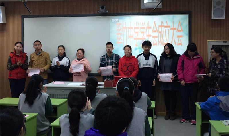 绽放热情,梦想起航 ------记常州市翠竹中学第一届学生会成立 2015年3月18日下午第三节课,虽然天空飘着春雨,但翠中演播室里却温暖一片,今天七八年级的部分师生齐聚这儿,召开常州市翠竹中学学生会成立大会。 随着主持人的宣布,常州市翠竹中学第一届学生会大会正式开始。 在今天二月份,我校举行的优秀学生干部培训班活动中,涌现了一大批有才华的学生,他们热情洋溢、有德有才,为了给这批孩子一个更高、更好地发展平台,学校决定成立第一届学生会,吸收这些优秀的同学成为学生会成员。会议开始,首先由我校路书记隆重宣读了第一届15位学生会成员名单,其中5位同学荣幸加入学生会核心组成员。热烈的掌声,是对他们成功的肯定;耀眼的奖状,是对他们今后的鼓励;自信的笑容,完美诠释了他们的喜悦…… 是金子总会发光,在同学们的背后,更有一批无私奉献的老师。接下来,学生会核心组成员给指导老师发聘书,作为学子的引路人,他们将会用自己的心血共筑新的辉煌!其次,在我校学生会管理成员中,八七班贺滨冰同学以出色的工作水平及认真态度进行了就职演说,引起学生会全体成员的一致肯定。我们都坚信,我们会为学校付出自己的微薄之力。最后,可亲可近的吴校长对学生会提出了要求,希他望新成立的学生会成员能不断提升自己、承担责任,聚焦远方、面向未来,主人意识、领袖风采,制定制度、传承文明,并从学生会的意义,如何更好的发展,我们的未来等几个方面进行了详细的阐述,再次为学生会成员引领了正确的道路。 热情绽放,梦想起航,在年轻的学生会带领下,我们会抬起年轻的面庞,挥动有力的翅膀,一起奋发努力,一起行进!