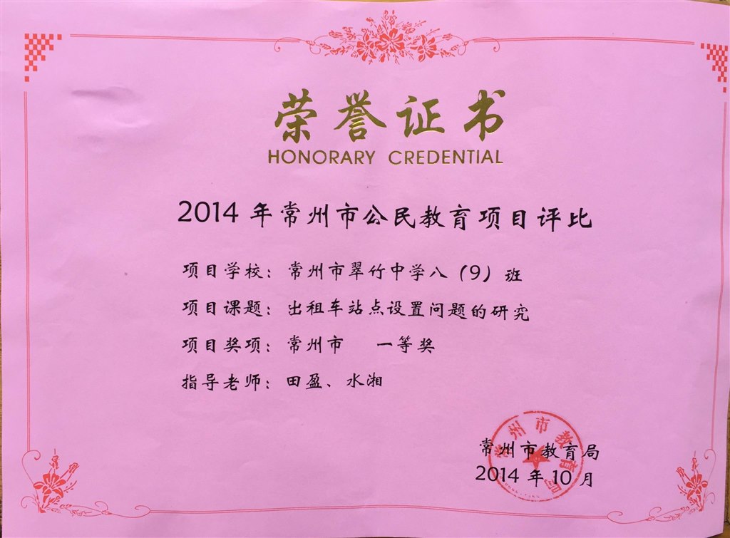 序号 | 学校 | 参评课题 | 实施班级 | 指导老师 | 获奖 | 1 | 常州市武进区焦溪初级中学 | 关于推进农村全民阅读的研究 | 八(6)班 | 胡鸣亚、 夏瑜、高叶红 | 一等奖 | 2 | 常州市花园中学 | 关于常州市流浪乞丐问题的研究 | 七(5)班 | 谈黎吉 | 一等奖 | 3 | 常州市武进区焦溪初级中学 | | 八(5)班 | 任银萍 史燕新 | 一等奖 | 4 | 常州市武进区郑陆初级中学 | 关爱空巢老人 | 八(6)班 | 毛刘红、 缪箐箐、卜萍 | 一等奖 | 5 | 常州市翠竹中学 | 出租车站点设置问题的研究 | 八(9)班 | 田盈、水湘 | 一等奖 | 6 | 常州市勤业中学 | 关于常州市雾霾问题的研究 | 八(2)班 | 阚玉英 | 一等奖 | 7 | 常州市武进区东青实验学校 | 东青社区电动车使用与管理的调查与研究 | 八(4)班 | 刘晓东 | 二等奖 | 8 | 常州市武进区东青实验学校 | 关于郑陆镇东青社区生活垃圾分类情况的调查与研究 | 七(1)班 | 王煜洁 | 二等奖 | 9 | 常州市武进区礼河实验学校 | 关于长顺路街边摆摊问题的研究 | 七(4)班 | 孔静、高晓燕、严红仙 | 二等奖 | 10 | 常州市正衡中学 | 关于信息公开的调查研究 | 八(10)班 | 虞洋 | 二等奖 | 11 | 常州市花园中学 | 关于常州市公交车拥挤问题的研究 | 七(10)班 | 谈黎吉 | 二等奖 | 12 | 常州市花园中学 | 关于常州市小区居民饲养宠物问题的研究 | 七(11)班 | 谈黎吉 | 二等奖 | 22 | 常州市北环中学 | 常州市生活垃圾分类处理问题的研究 | 八(5)班 | 祝畅红、奚维君 | 二等奖 | 13 | 常州市武进区东青实验学校 | 东青居民废旧手机的回收利用情况调查与研究 | 八(2)班 | 朱丽洁 | 三等奖 | 14 | 常州市武进区东青实验学校 | 关于东青社区绿化带管理问题的调查与研究 | 八(3)班 | 姚建芬 | 三等奖 | 15 | 常州市武进区东青实验学校 | 校门口流动摊点问题的调查与研究 | 七(2)班 | 潘海波 | 三等奖 | 16 | 常州市武进区东青实验学校 | 关于“东青社区文体设施建设与使用”的调查与研究 | 七(3)班 | 胡志英 | 三等奖 | 17 | 常州市武进区东青实验学校 | 广场舞扰民问题的调查与研究 | 七(4)班 | 殷玲燕 | 三等奖 | 18 | 常州市武进区郑陆初级中学 | 关于农村封建迷信活动的研究 | 七(5)班 | 吴赛花 、吴卫星、毛刘红 | 三等奖 | 19 | 常州市同济中学 | 同济桥周边居民文化资源的保留与利用 | 八年级 | 黄婉蓉、杨丽 | 三等奖 | 20 | 常州市正衡中学 | 关于道路安全问题的调查与研究 | 八(7)班 | 贺莉萍 | 三等奖 | 21 | 常州市正衡中学 | 从中学生角度对高考加分政策的相关调查 | 八(8)班 | 吴琦 | 三等奖 | 23 | 常州市北郊初级中学 | 关于冯仲云和王诤将军故居的调查 | 八年级 | 吴文普 | 三等奖 | 24 | 常州市潞城中学 | 关于家庭厨余垃圾处理问题的研究 | 八(5)班 | 龚芳琴 | 三等奖 |